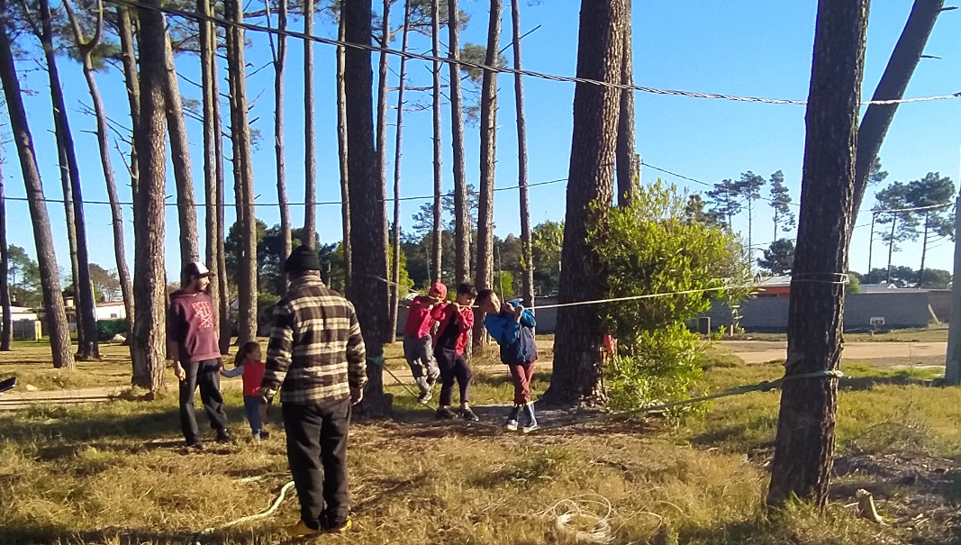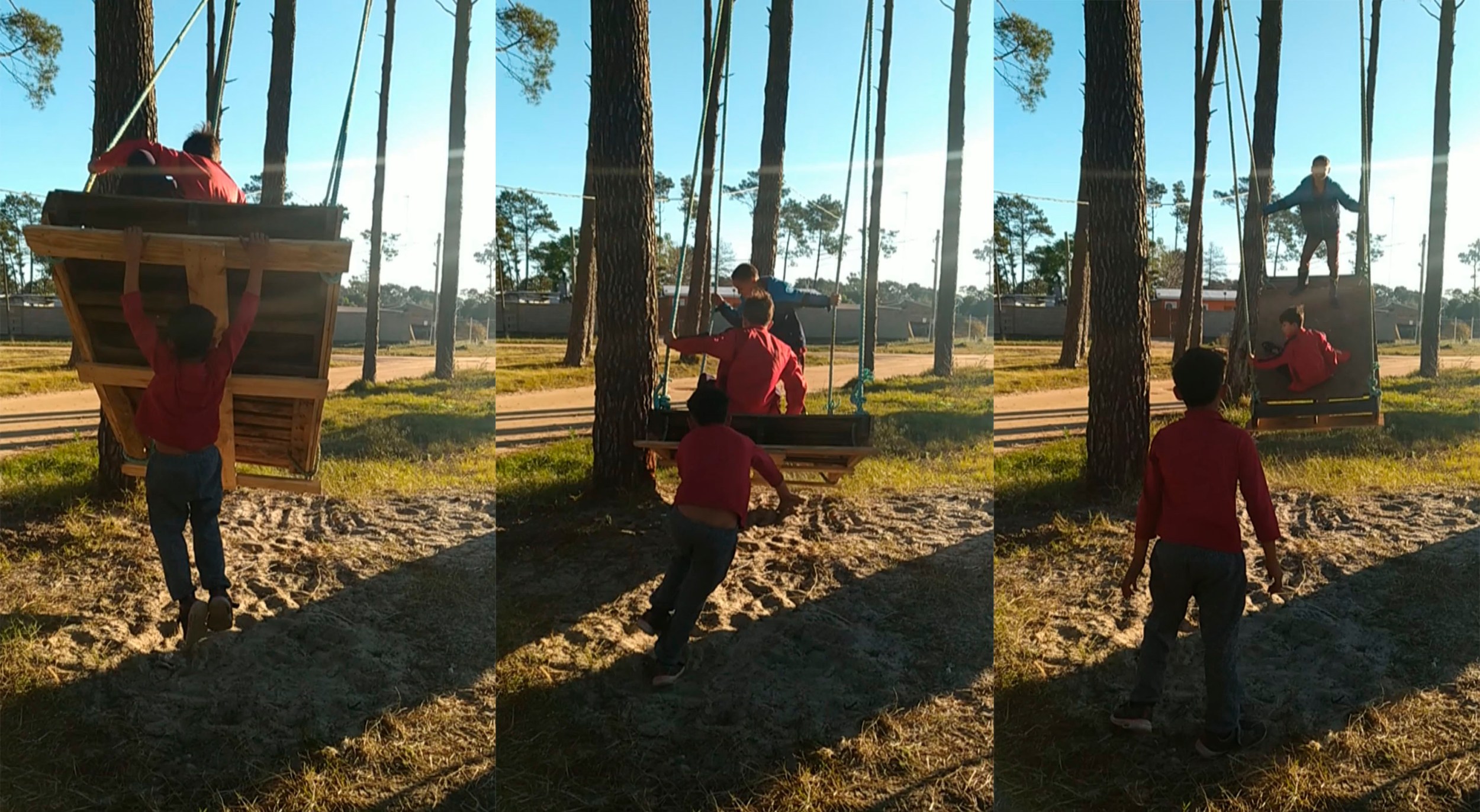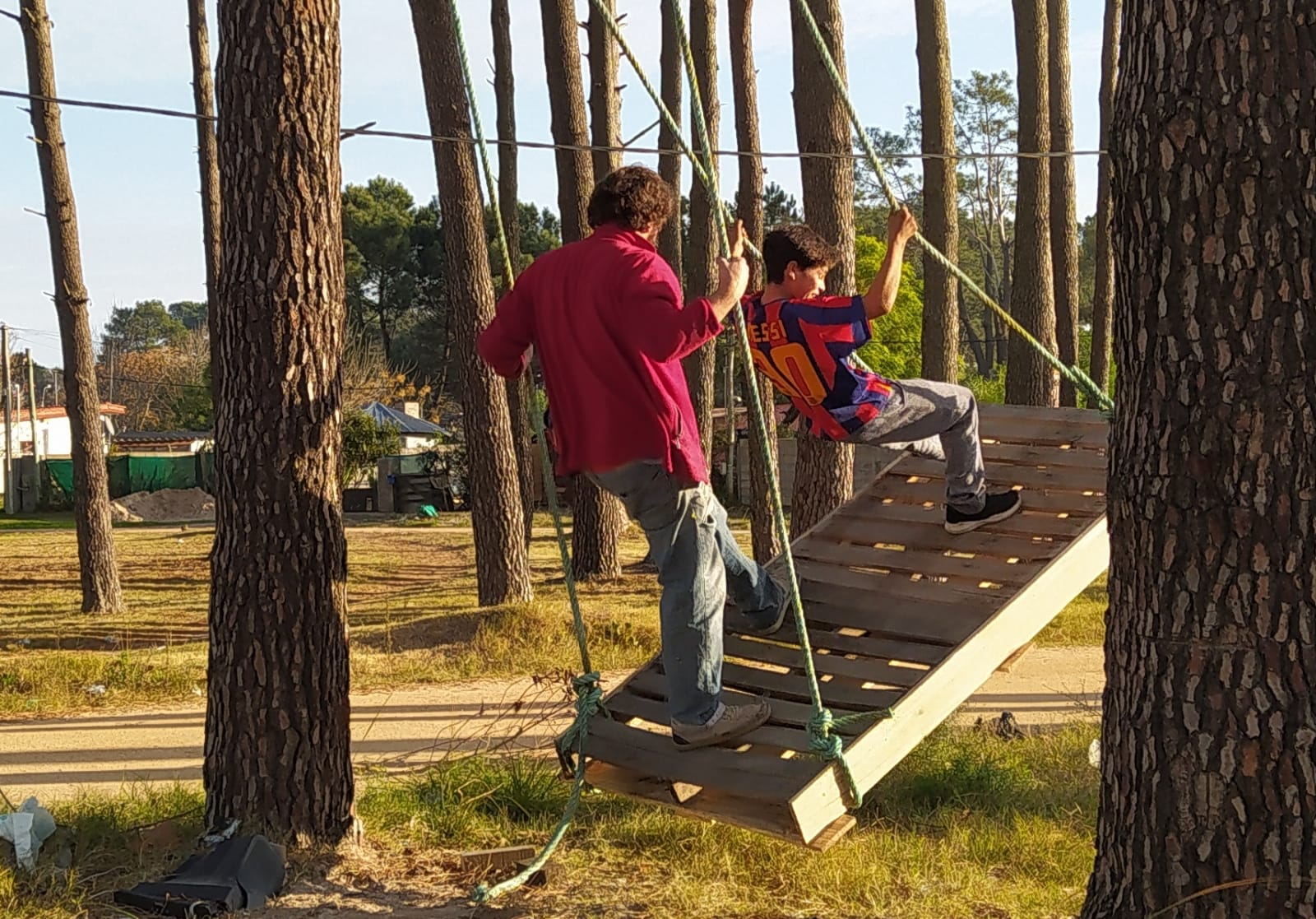 Un mojón importante fue el diseño de la «gran hamaca barco» construida con pallets y cuerdas marineras, colgada entre los árboles. Vertiginosamente se hamaca, grupos de niños y adolescentes frenéticos se suben y buscan el equilibrio mientras otros no paran de empujarla. Una marea de cuerpos entremezclados, alegres y eufóricos, se abren a una aventura desmesurada que solo la entienden quienes se suben a ella. Tres veces se ha roto, tres veces se han diseñado soluciones estructurales que den con la solución a esa demanda enérgica que parece querer probar los límites de la gravedad.