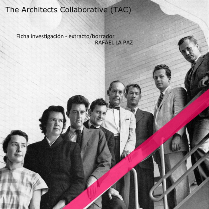 NOMBRE: The Architects Collaborative MODALIDAD: Ficha investigación – extracto/borrador FECHA: Marzo 2017 INVESTIGACIÓN : Rafael La Paz REFERENCIA : TAC (The Architects Collaborative 1945-1970). Editorial Gustavo Gili S.A. (1972). Introducción Sam T. Hurst. DESCARGA PDF: TAC – Ficha investigación #Acercamiento a la metodología de trabajo del estudio de arquitectura The Architects Collaborative que realizó su práctica profesional entre 1945…